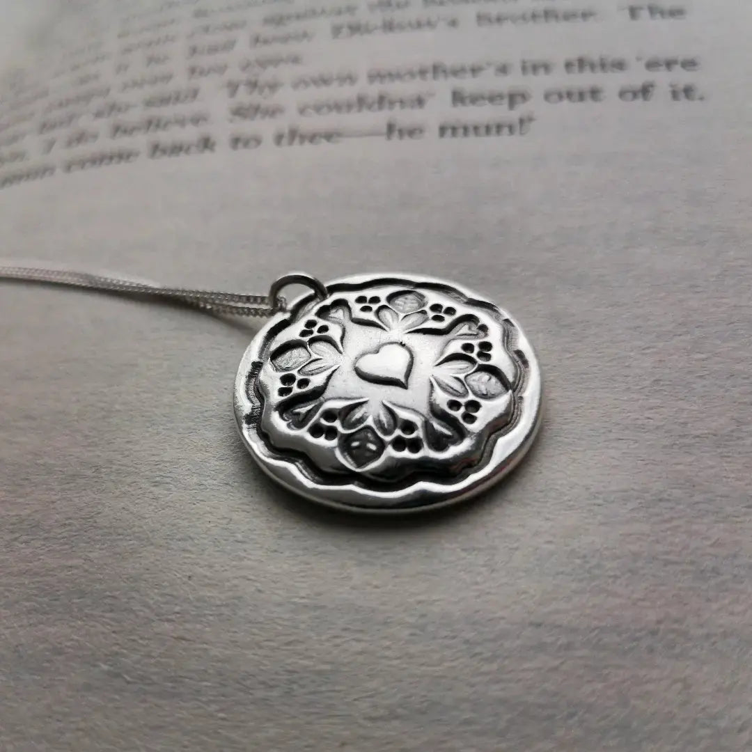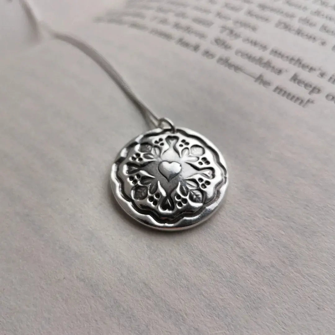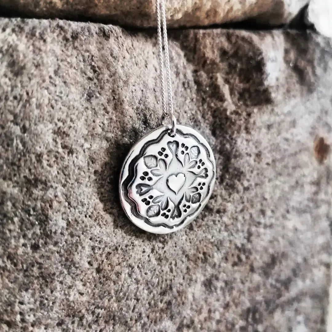 Made from chunky solid silver and measuring 2.5 cm across, the silver has been stamped and oxidised to highlight the textures.