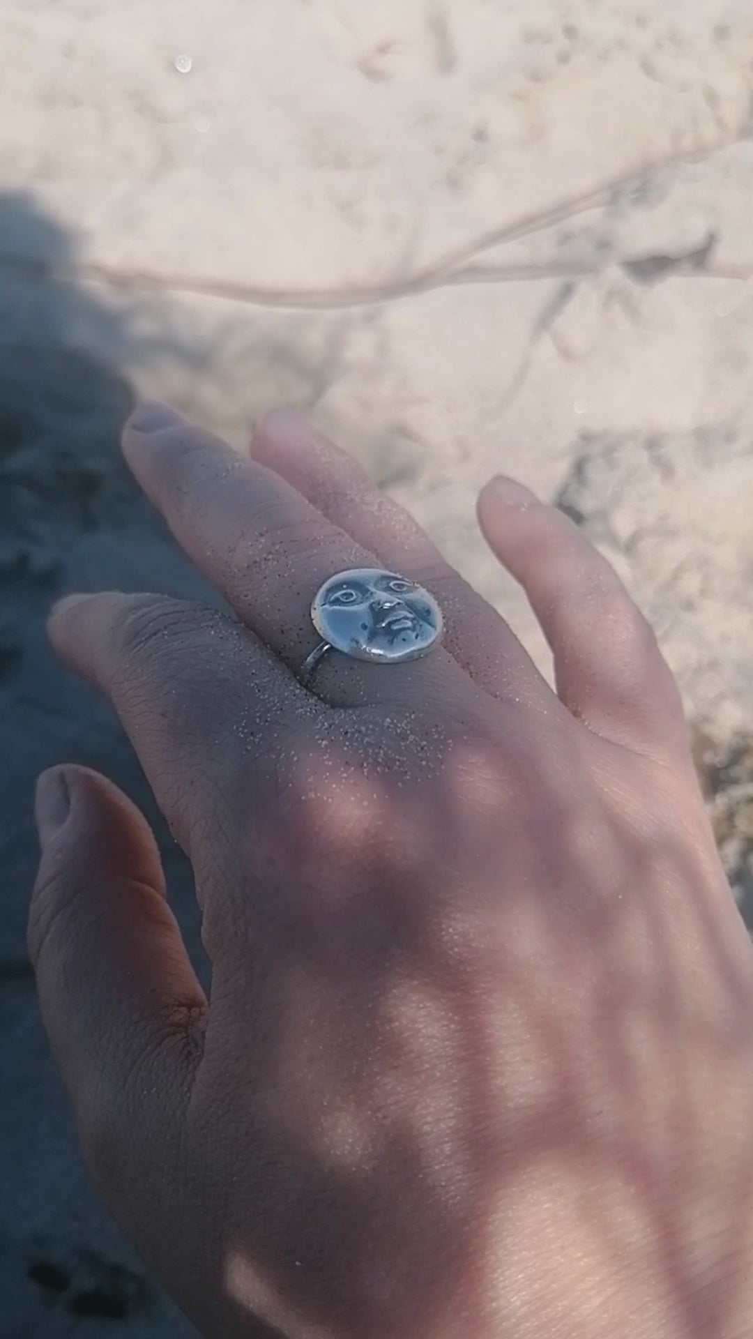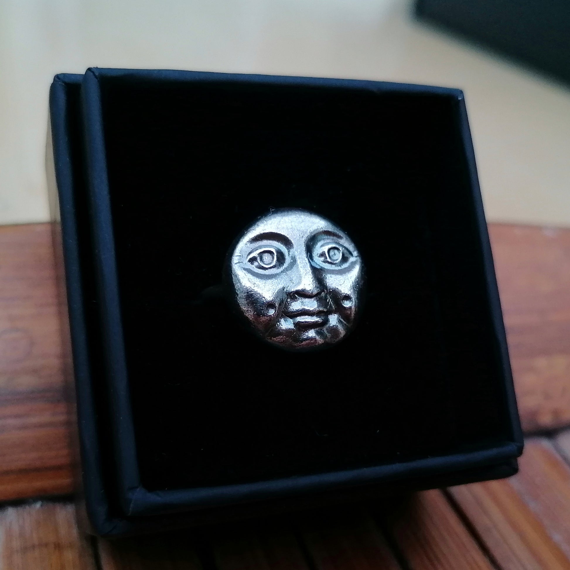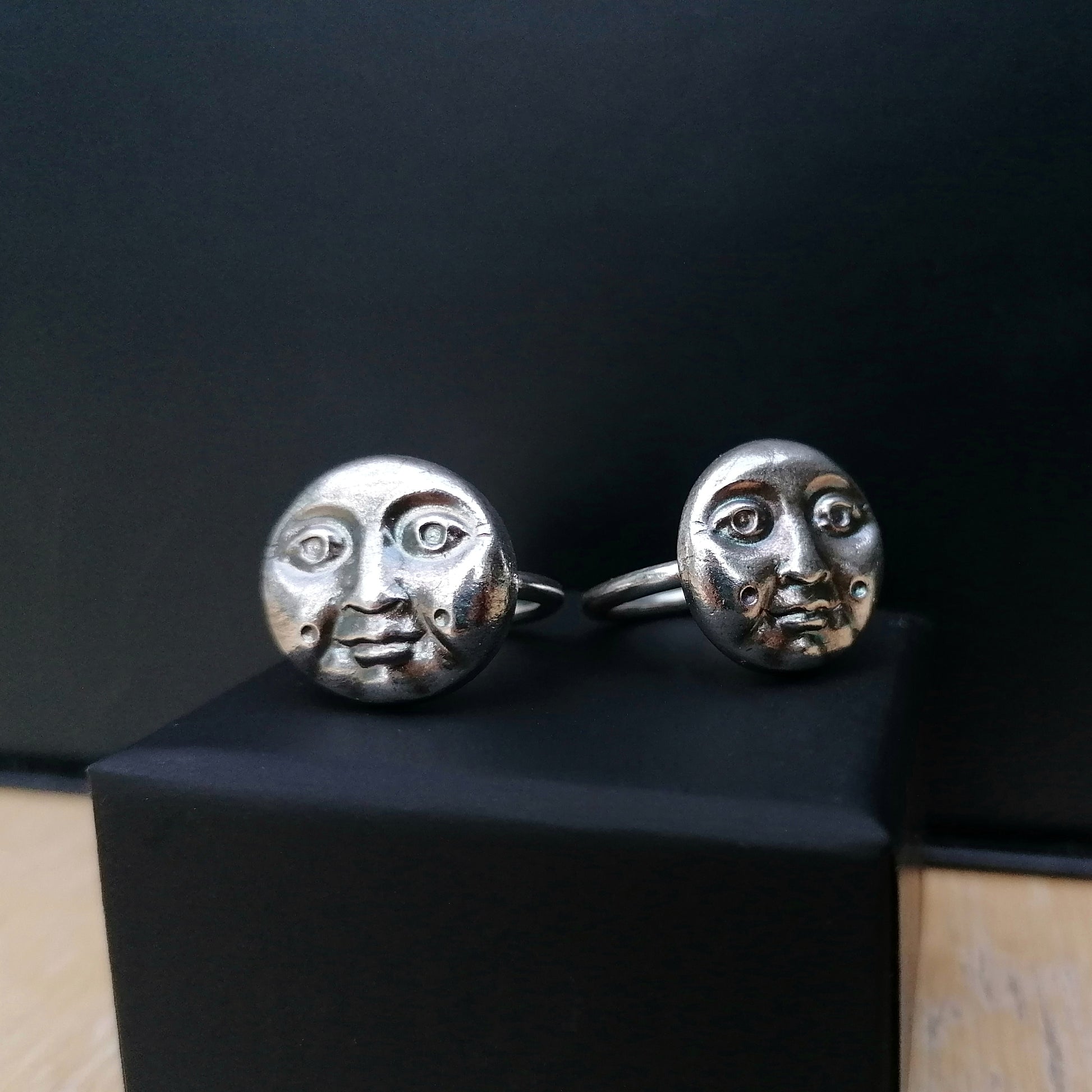 A handmade, super shiny moon man, attached to a sterling silver band, treated with sulphur to give an aged effect.