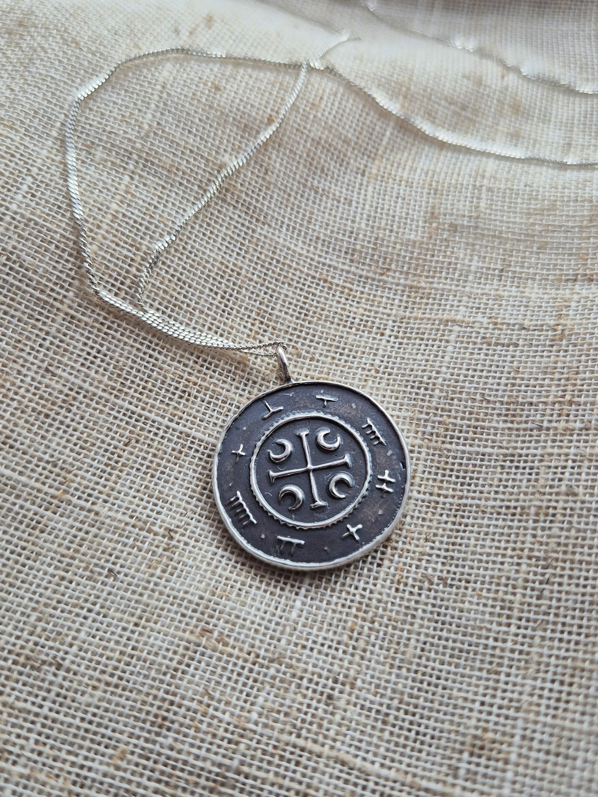 The coin is stamped using my own design, and is made from 100% recycled sterling silver. The pendant comes with a recycled 18-inch sterling silver chain, and the coin itself measures 20mm at its widest, with the total height (including the bail ring) reaching 25mm.