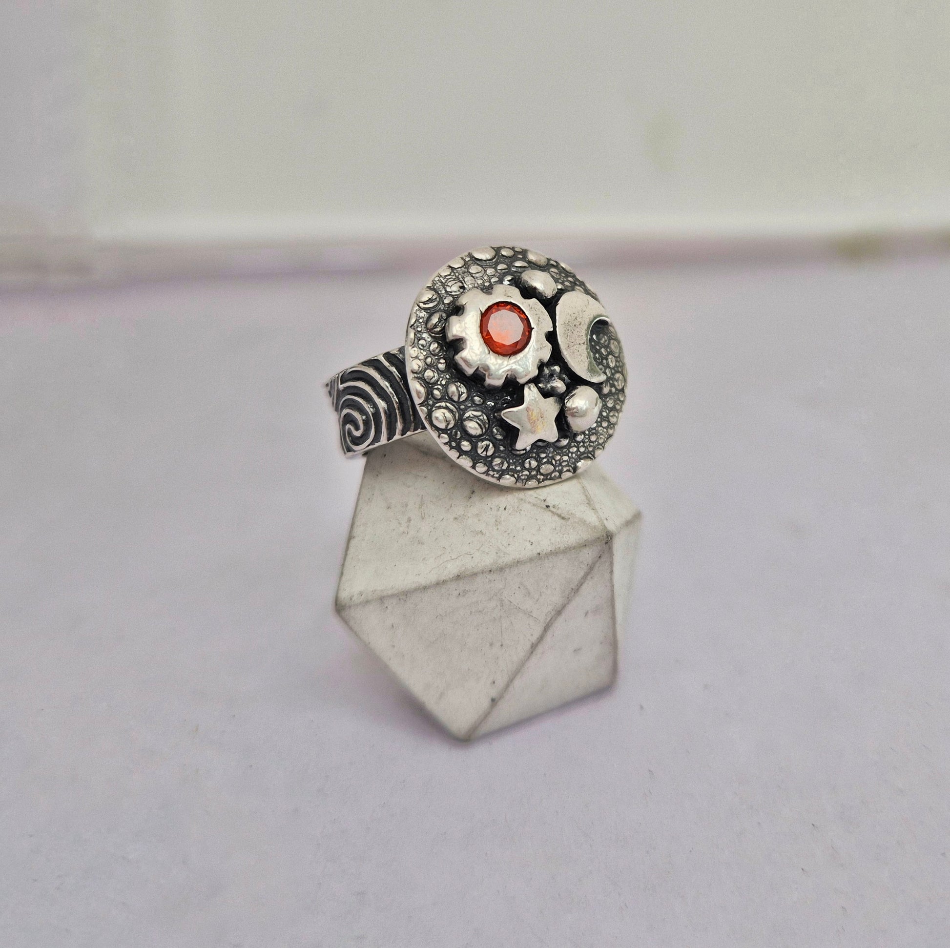 Handmade from sterling silver, the one-of-a-kind Cosmic Ring is a bold, chunky design set with a bright red stone that glows with fiery energy.