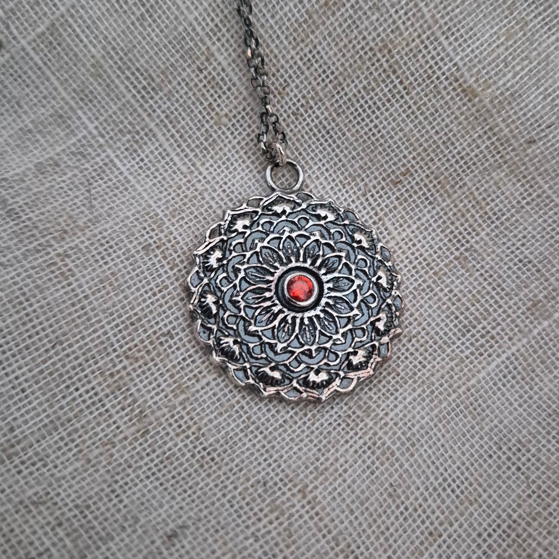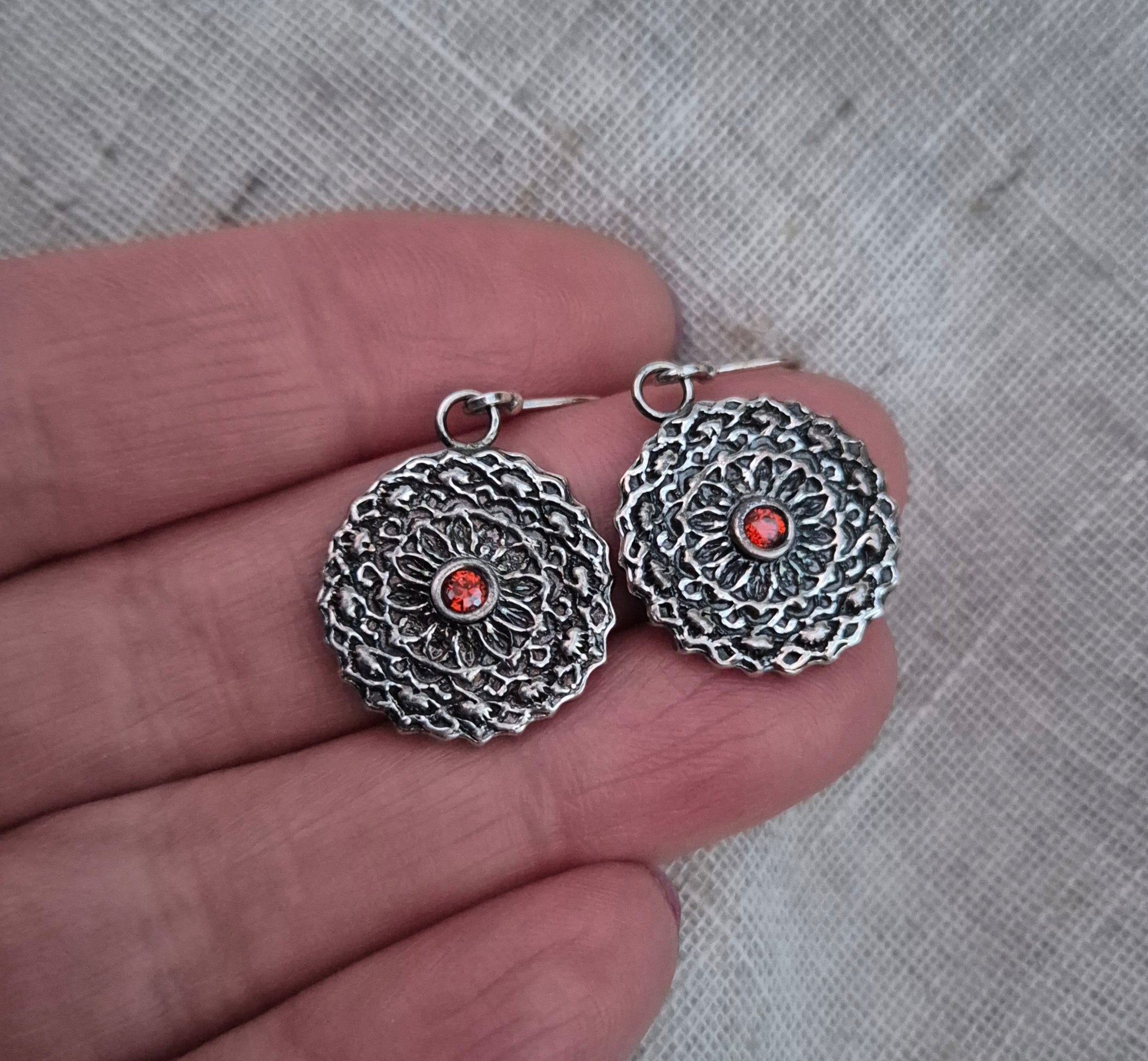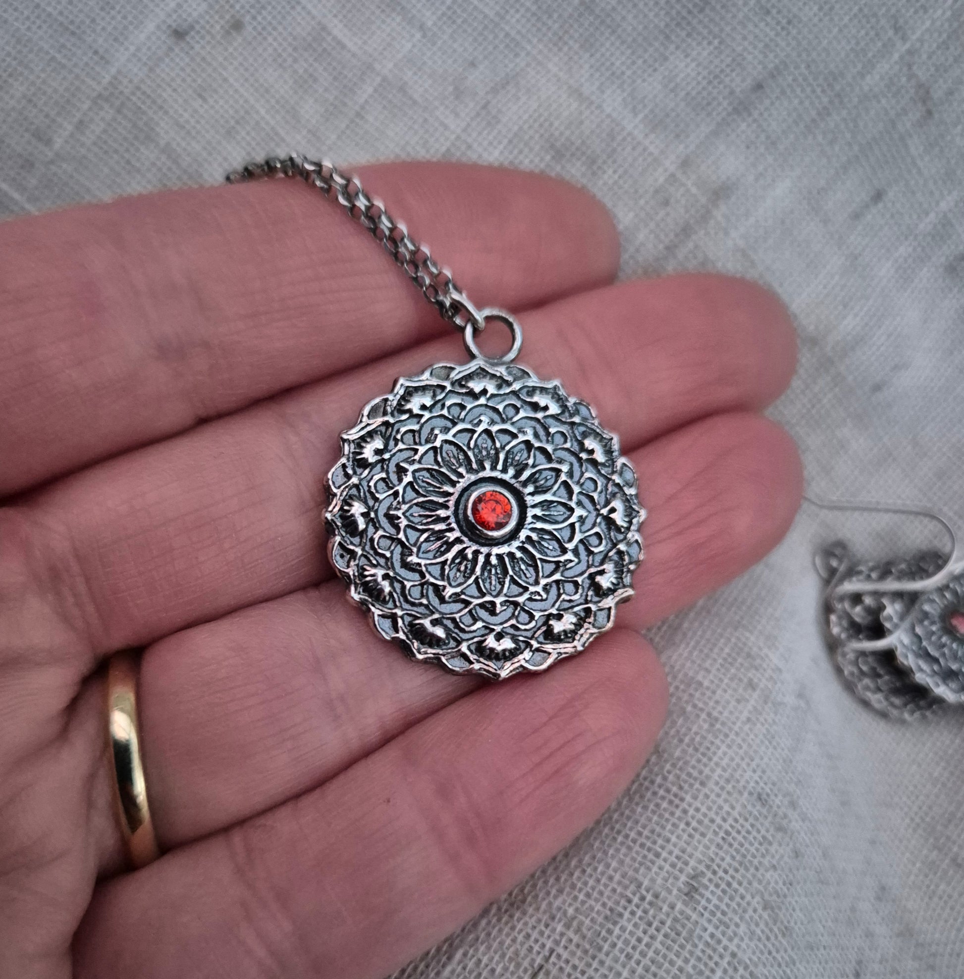 Mandala is a timeless spiritual symbol, and this earrings and pendant set has been lovingly handmade from recycled fine silver. They feature intricate, detailed flower patterns, red CZ stones, and are the perfect accessory to bring a little bit of hippie-chic to your wardrobe.