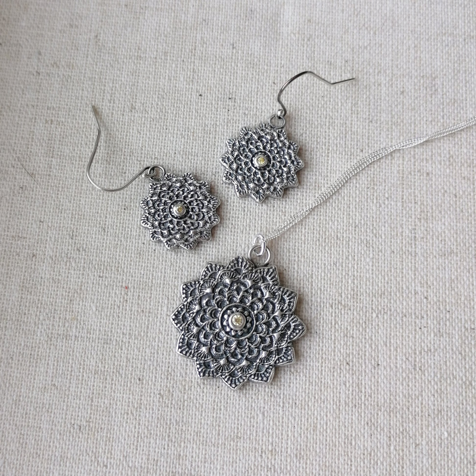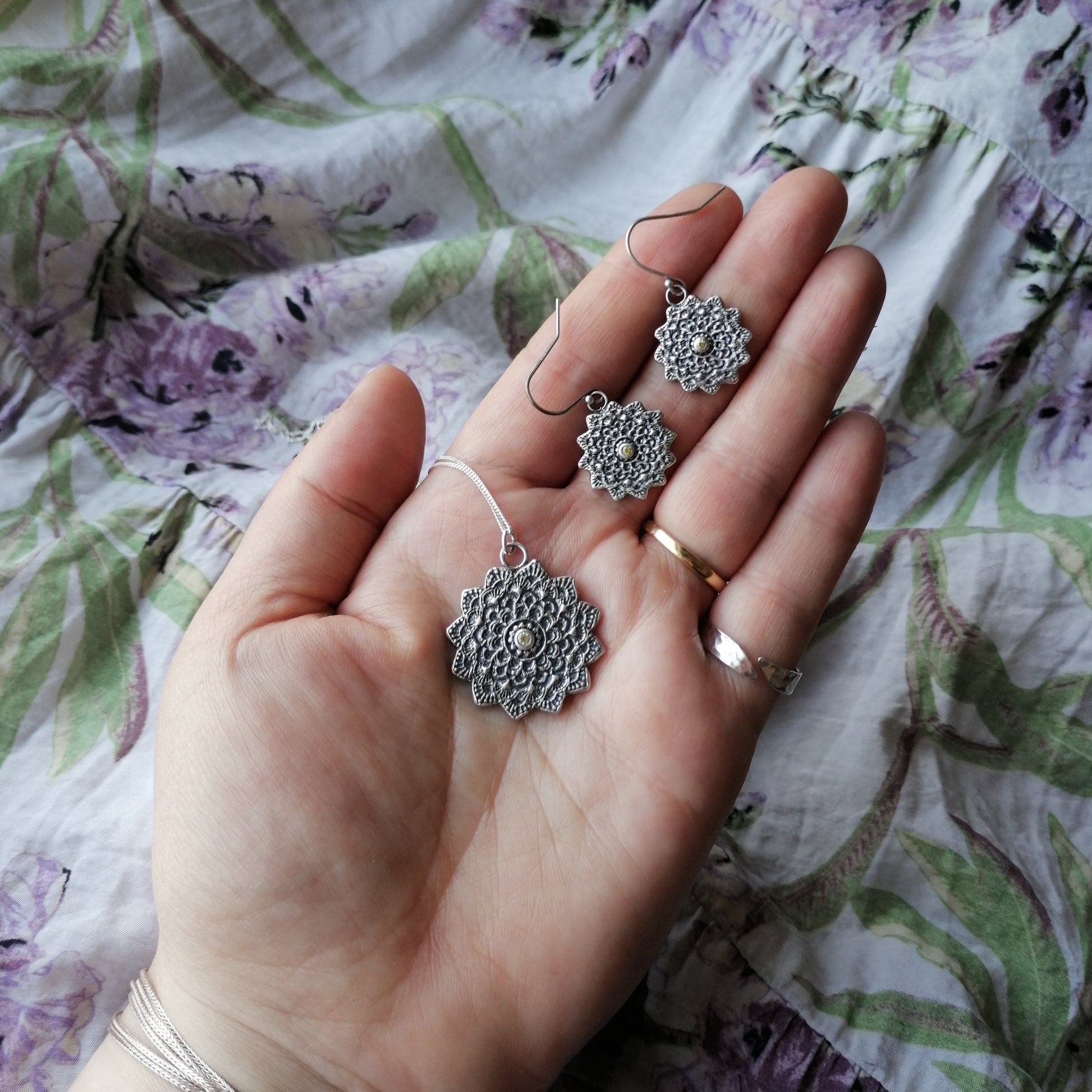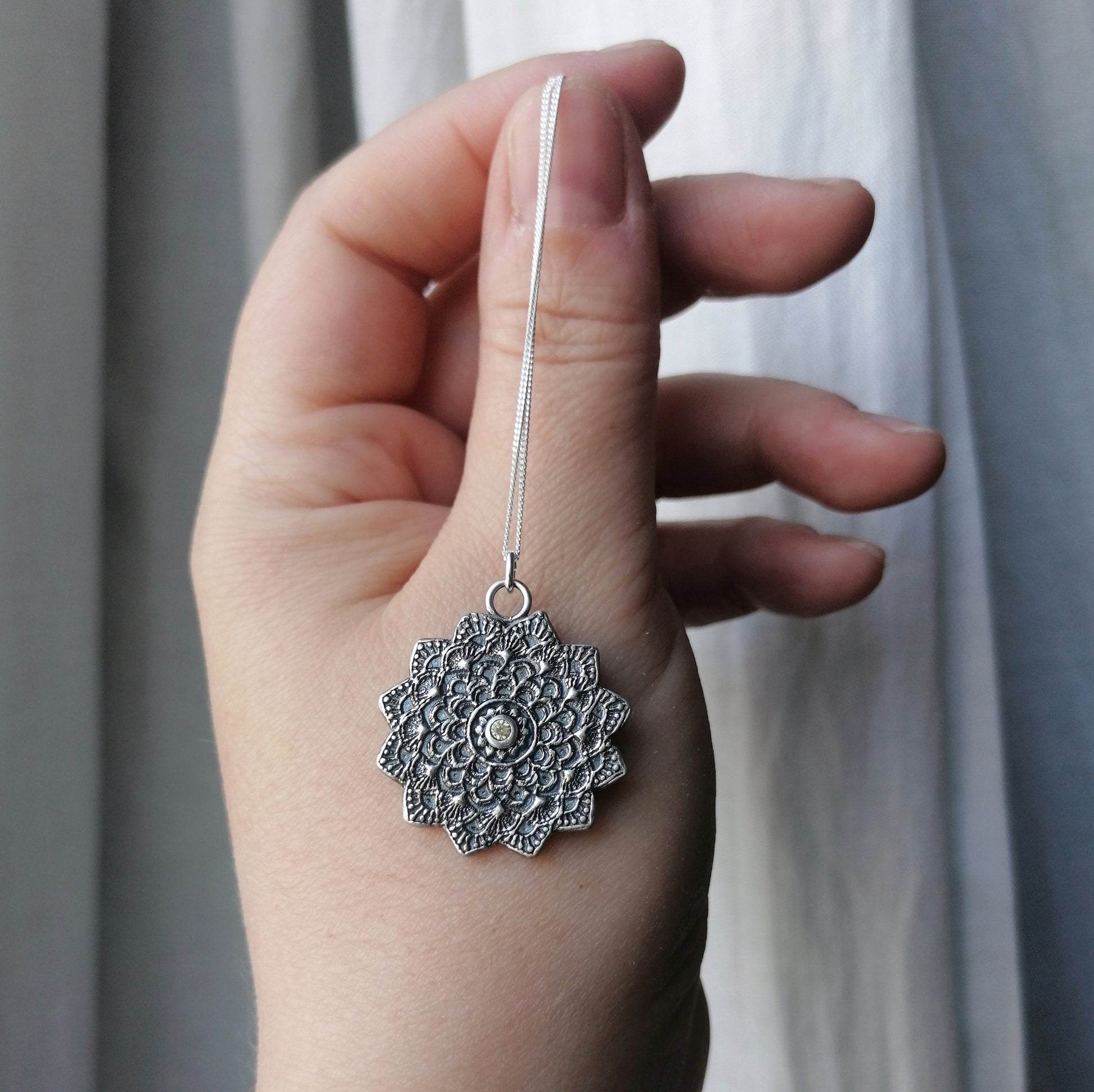 Mandala is a timeless spiritual symbol, and this one is lovingly handmade from recycled fine silver. It features an intricate, detailed pattern, with a sparkling lemon CZ centre.