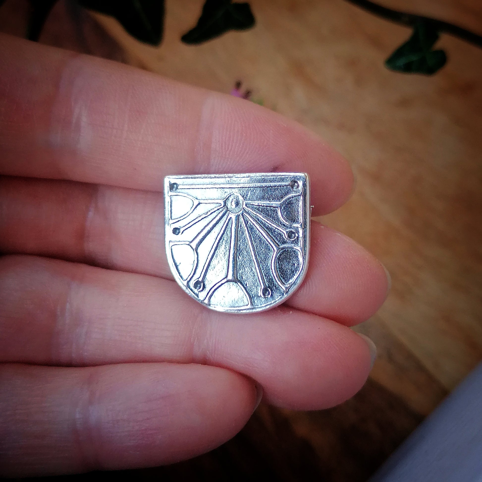 A unique handmade brooch based on the medieval sundial found at the ruins of Nendrum monastic site on the shores of Strangford Lough.