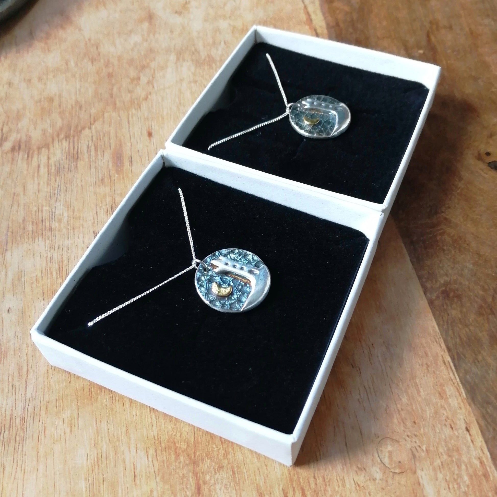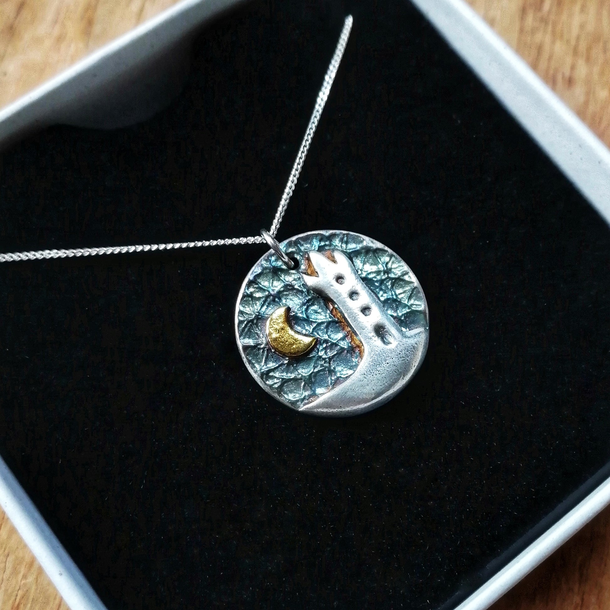 Each pendant is handmade to order, pressed from a texture made by me. I then paint layers of gold paste onto the crescent moon, fire it, oxidise the silver to give an antique look and polish by hand. It is supplied with an 18 inch sterling silver chain (pictured).