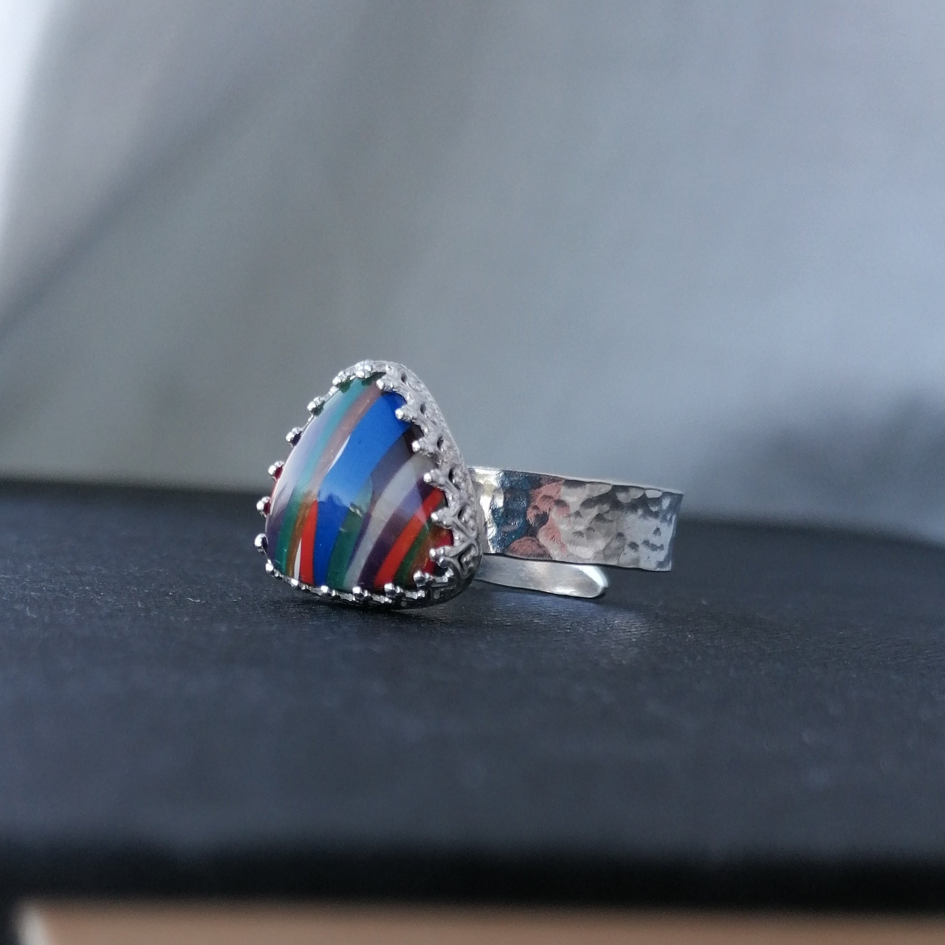 It is set in sterling silver, with a thick, hammered adjustable band, and would fit a medium to large ring size best.