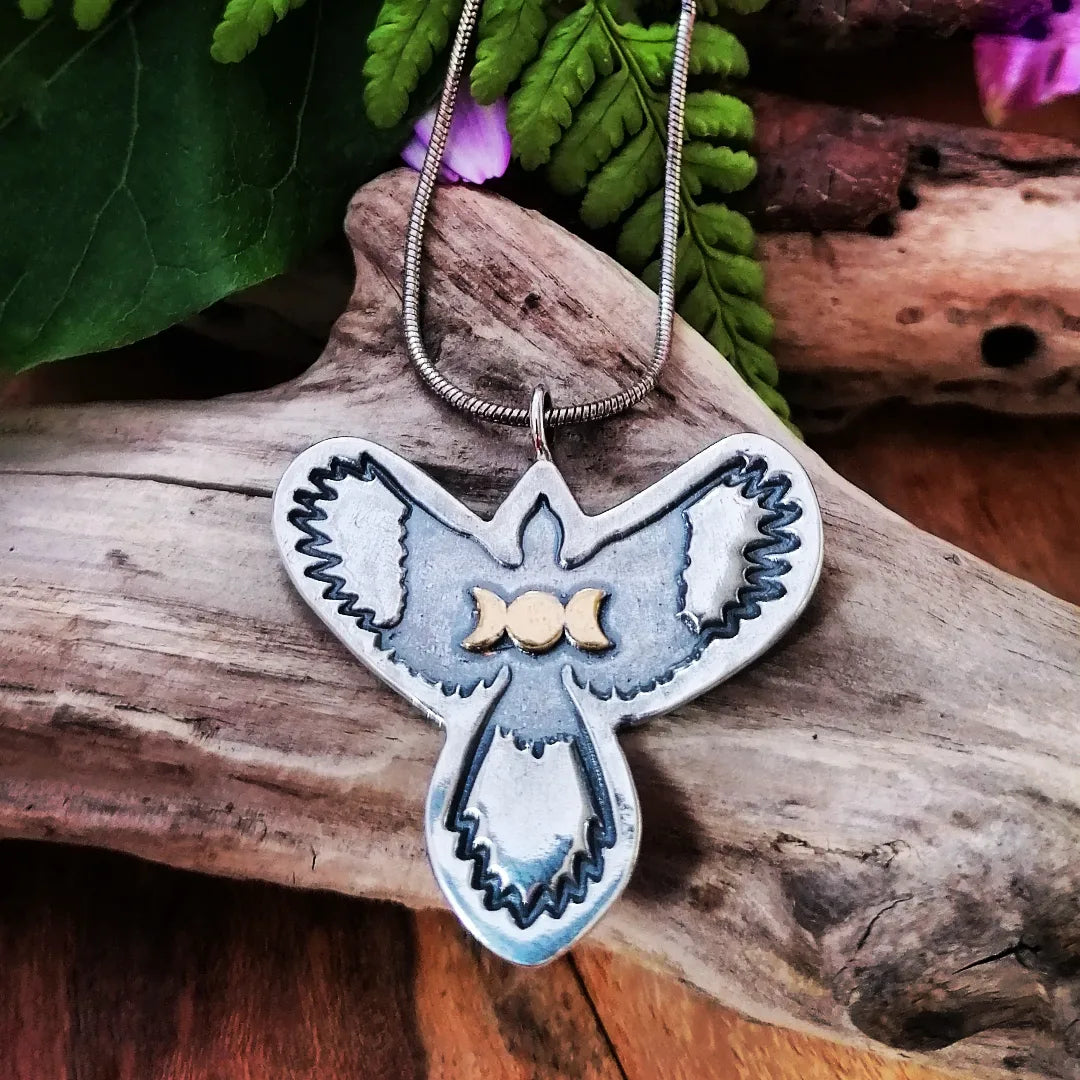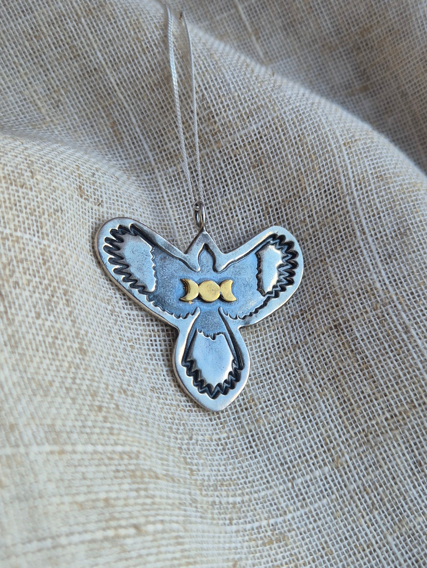 My take on the feisty, shapeshifting Celtic goddess The Morrigan. The chunky little 3d crow is made from oxidised sterling silver and topped with a 24k gold keum boo triple goddess symbol.